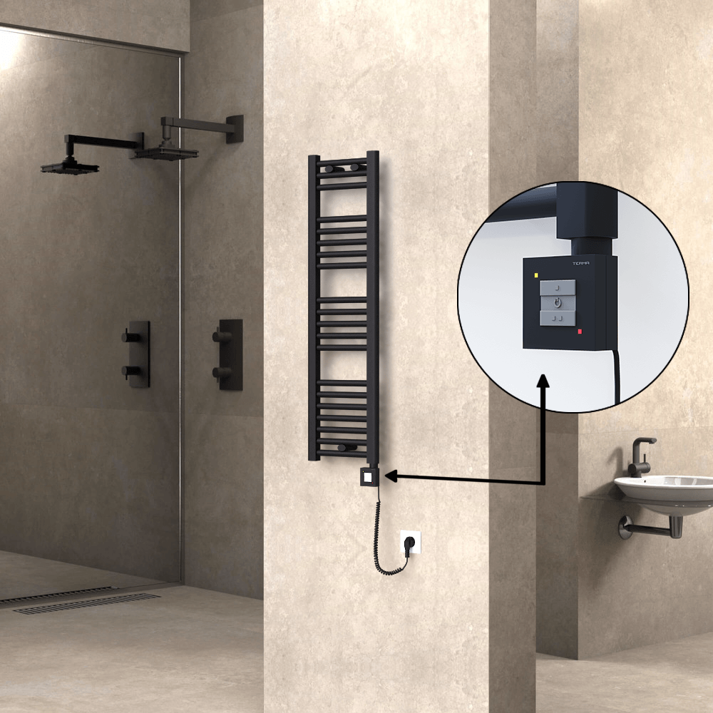 AKS SeçenekleriHaiti Sèche Serviettes Electrique 300x1100 Noir mat Ktx3 300 Watt Câble en spirale 20 Tuyeaux |Chauffe 2-5 m2 -