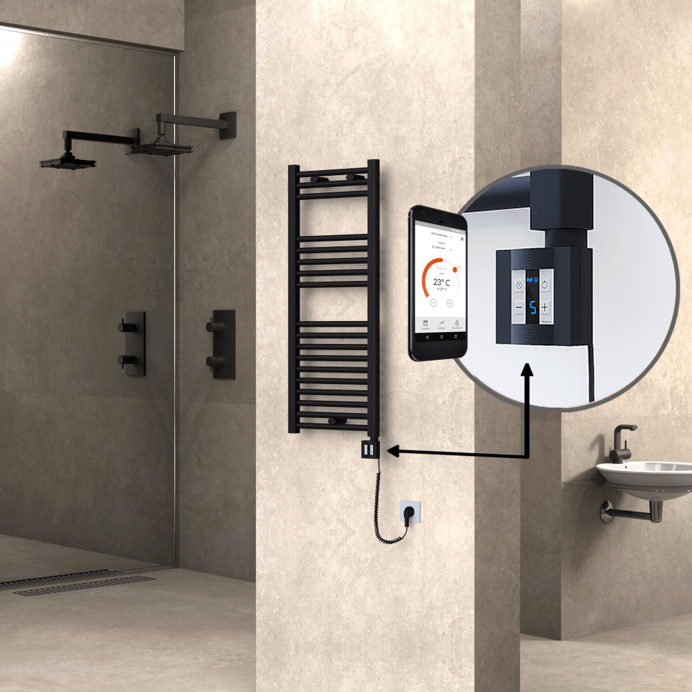 AKS SeçenekleriHaiti Sèche Serviettes Electrique 400x1000 Noir mat Ktx1 300 Watt Câble en spirale 18 Tuyeaux |Chauffe 2-6 m2 -