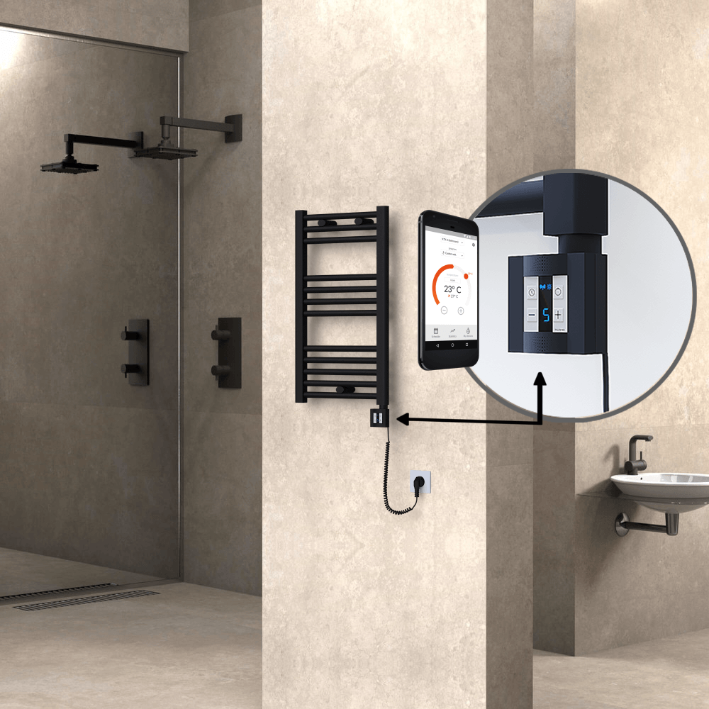 AKS SeçenekleriHaiti Sèche Serviettes Electrique 400x700 Noir mat (Thermostat Thesis) 300 Watt 12 Tuyeaux |Chauffe 1-4 m2 -