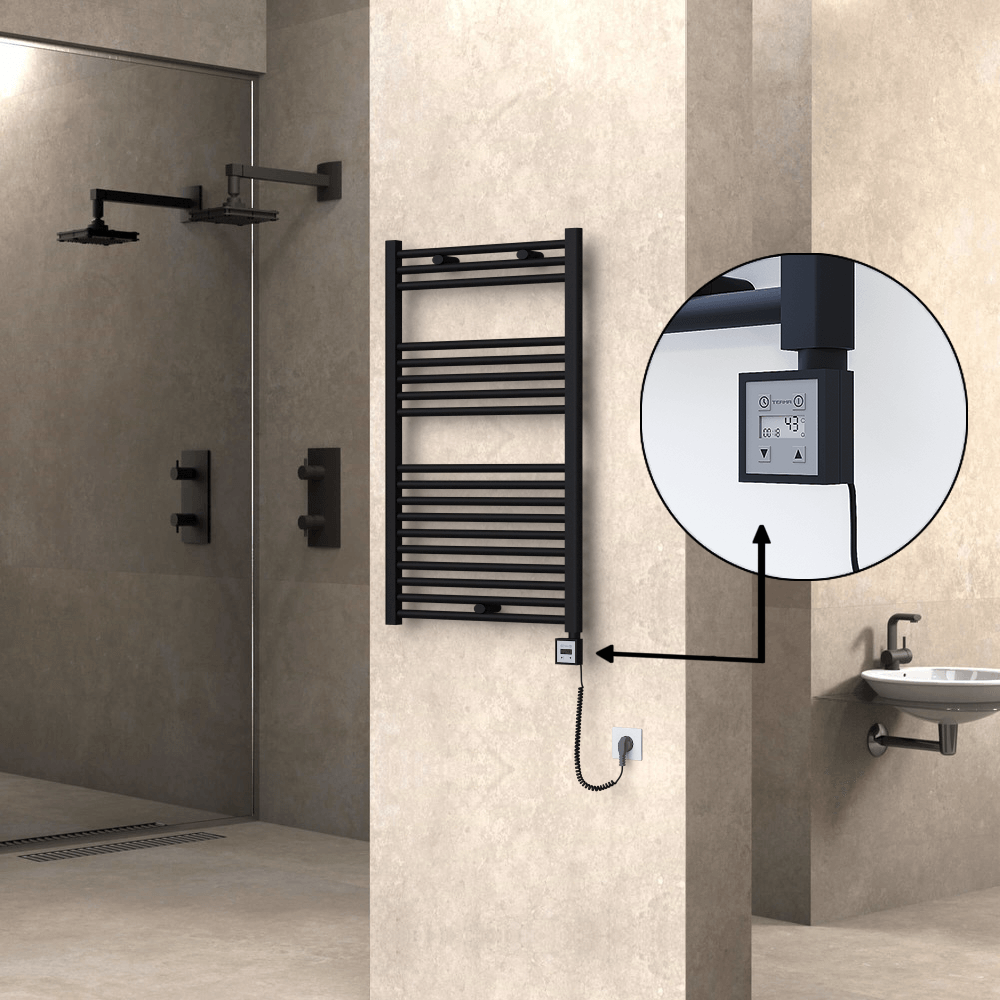 AKS SeçenekleriHaiti Sèche Serviettes Electrique 600x1000 Noir mat Ktx4 600 Watt Câble en spirale 18 Tuyeaux |Chauffe 3-8 m2