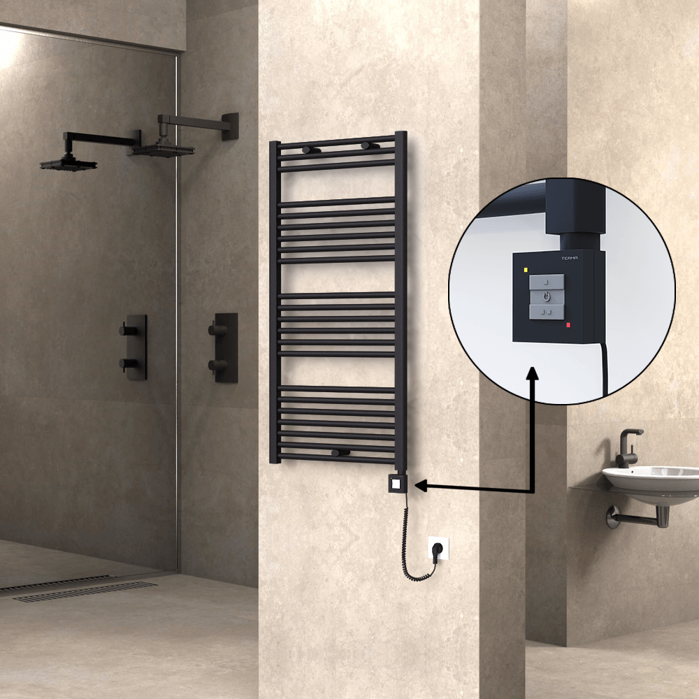 AKS SeçenekleriHaiti Electric Towel Warmer 600x1200 Flat Black Matt (Thesis Thermostat) 600 Watt 22 Pipes | Heats 3-10 m2 -