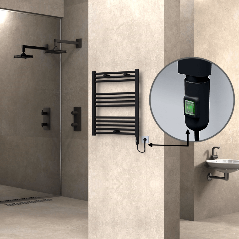 AKS SeçenekleriHaiti Sèche Serviettes Electrique 600x700 Noir mat Ktx4 300 Watt Câble en spirale 12 Tuyeaux |Chauffe 2-6 m2